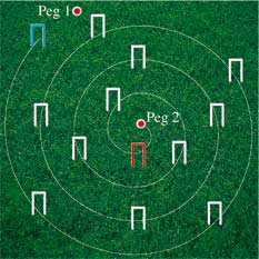 Zum Beispiel Golf Crocket: Alle Tore werden laut Grafik 2 x durchspielt, jedes Tor bringt einen Punkt. Wer es durchspielt, erhält einen Extraschlag. Für alle anderen ist es "gelöscht". Auf zum Nächsten! Wer zuerst 7 Punkte erringt, hat gewonnen. Der Peg (Zielholz) spielt dabei keine Rolle. |